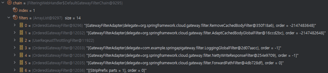 제가 등록한 UserRequestThrottlingFilter가 우선순위가 정상적으로 된 걸 보았는데NettyWriteResponseFilter 보다는 낮을 걸 확인 할 수 있습니다.
