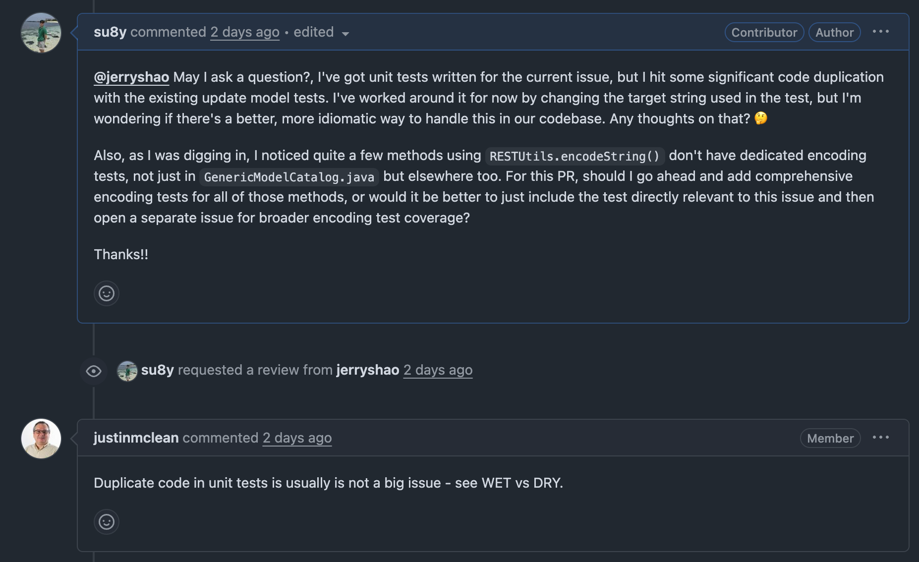 최근 Apache 오픈소스 프로젝트에 기여하면서 유닛 테스트 작성에 대한 흥미로운 고민에 빠졌습니다. PR(Pull Request)을 보내는 과정에서 기존 테스트 코드와의 중복 문제에 부딪혔고, 이 과정에서 WET(Write Everything Twice)과 DRY(Don't Repeat Yourself) 원칙에 대한 인사이트를 경험했습니다.